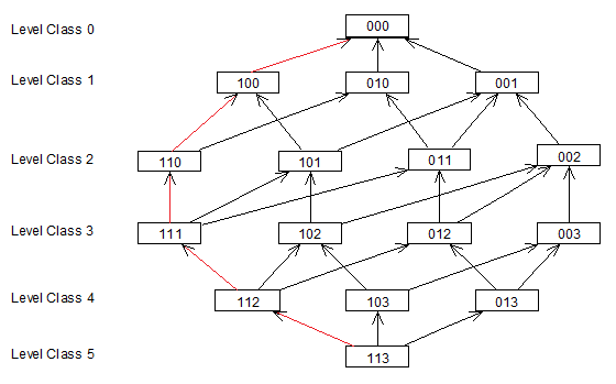 Since aggregation from 003 to 002 might not be optimal, the system may also use 012 or 102 for aggregation, when the number of aggregation instances on these levels is lower.