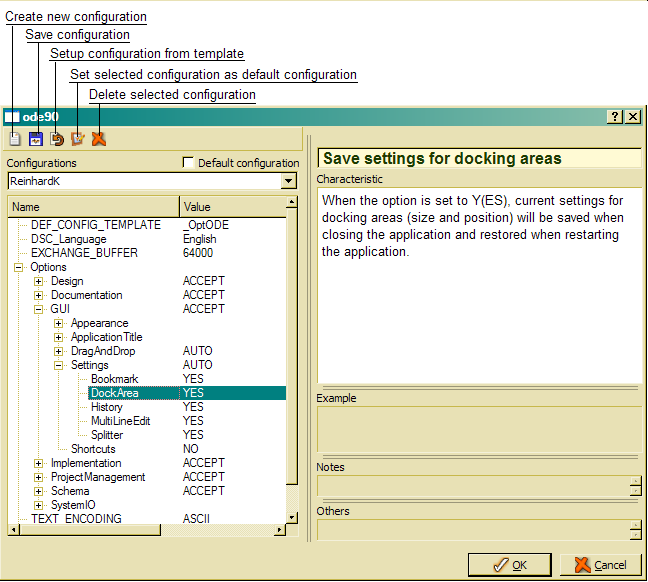 A simple way of defining options is writing an appropriate OSI script. The data source opened has to refer to the database, were the options are to be stored. This is the typical way of predefining options, when no ODABA GUI and tools have not been installed. When an option template has been defined as appropriate enumeration in the resource database, the new configuration will be initialized from the template.