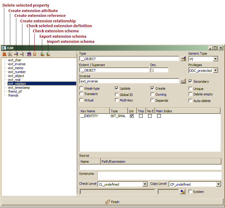 The property definition dialog allows creating attributes, references and relationship definitions, but also importing or exporting extension schemata from/to ODL.