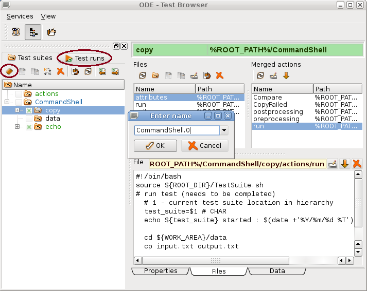 Since any number of test runs may be created for the same set of test cases, test runs should get a number or any other indicator after the name referring to the test run content. After entering and confirming the test run name, the "Create a new test run" action has to be clicked in the action button list above the test suites tree. Now, the test run may be executed by selecting the Test runs tab.