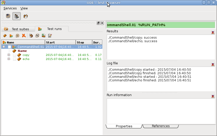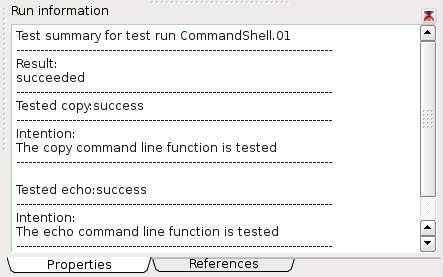 After running the test, tests successfully executed are displayed with green color. Tests failed become red. On the right side test results are listed for all executed tests and start/stop statistics are shown in the log file box as well as in the tree. Log file statistics are created by the command shell test framework while tree statistics are created by TestBrowser .