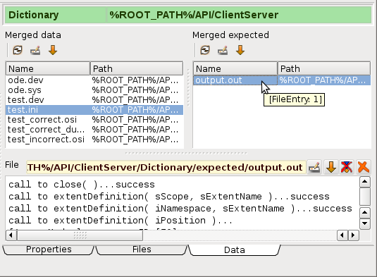 The Merged expected list contains the expected files that are used for comparing test results after running the test. All data files contained in expected sub directory for the current and all parent directories are collected. Data files in lower expected directories get higher priority, i.e. those will overwrite data files in higher expected directories. The current expected directory has got highest priority. Actions supported for the list are described in "Merged expected list actions".