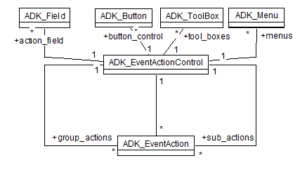 Event actions may get a number of group or sub actions ( ADK_EventAction ). Group actions are, typically, displayed as group (in a menu or tool bar). Sub actions are displayed in a sub-menu of the menu or tool bar. Each event action may define the action to be executed completely or refer to an event action control, which defines the event action to be executed.