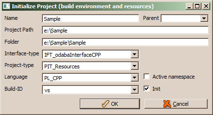 When changing the interface type, the suggested programming language will be selected (e.g. CPP when selecting IFT_odabaInterfaceCPP ). One may mix C++ or CSharp (C#) implementations with OSI, i.e. any implementation class in a C++ or C# project may contain mixed function implementations. One may, however, not mix C++ and C# within a project. For C# projects, vs (Microsoft visual studio) should be selected as build environment (Build-ID). C++ projects may choose between vs , gcc (GNU compiler). When you are going to use the ODABA build environment (obe), obe should be selected. One also may define any other environment (see Build Support ).