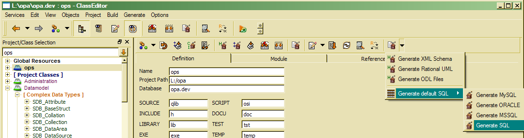 A checked ODABA database model can be converted to several types or relational models (MySQL, ORACLE, MS SQL server, ANSI SQL). In order to convert data type and extent definitions for a module or project into SQL table definitions, one may call the appropriate action from the module or project window in ClassEditor . By selecting a module or project in the application tree, the project or module window will be displayed in the work area. The toolbar of the work window provides the schema generator menu, which offers several external schema types:
