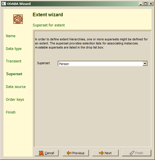 When more than one extent have been defined for the data type, the drop list provides all available extents for the selected data type. When not defining a superset for the extent, the extent is considered to be an owning extent and referenced instances are deleted when they are removed from the extent collection. In order not to define a superset.the Superset field has to be cleared. before continuing with Next .
