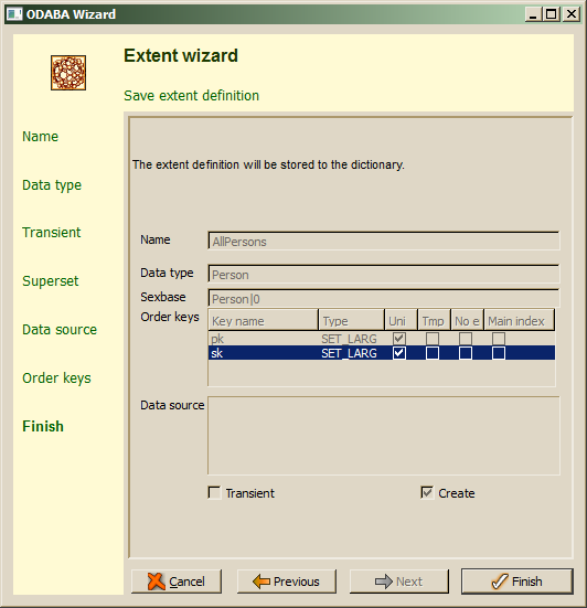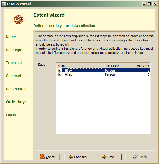 Key definitions for the data type of the extent are listed as access key (sort order) candidates. By default, the primary key is selected to be used as access key. One should select only those keys, which are really needed for ordering the extent collection. Extents must contain at least one access key.
