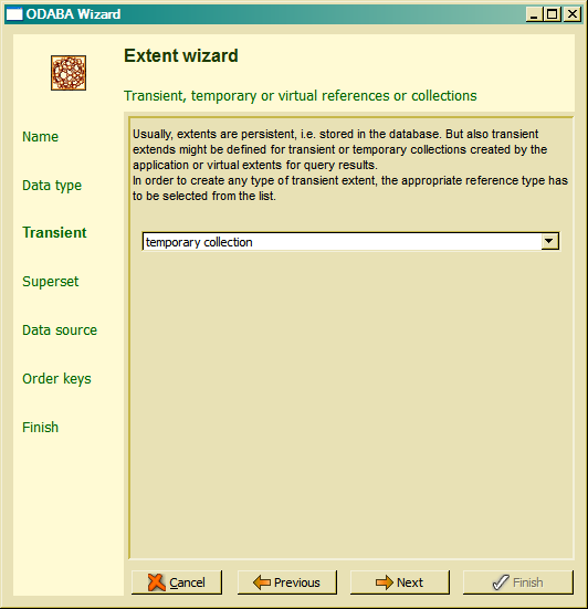 Temporary or transient extents allow storing derived data in a temporary database area or in memory (transient). Temporary or transient collections cannot be shared between applications. Filling temporary or transient collections is possible by OSI expressions defined in the data source or in a context class handler function (typically doAfterOpen() ).More details are described in the "Temporary collections" and "Transient Collections" sub topics of the Reference documentation.
