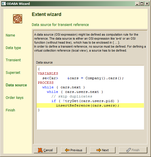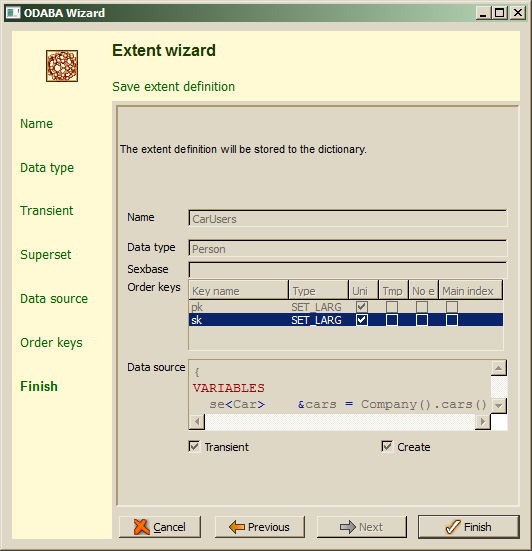 For temporary or transient collections, a data source should be defined for filling the collection. Temporary or transient collections with a data source definition are filled only, when being accessed. When not defining a source expression, the extent has to be created when being opened (typically in the doAfterOpen() handler for the extent property class). The Next step allows selecting one or more access keys (order keys).