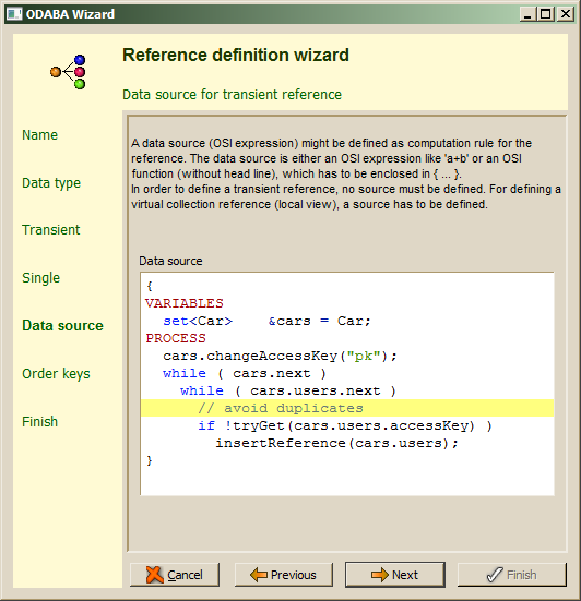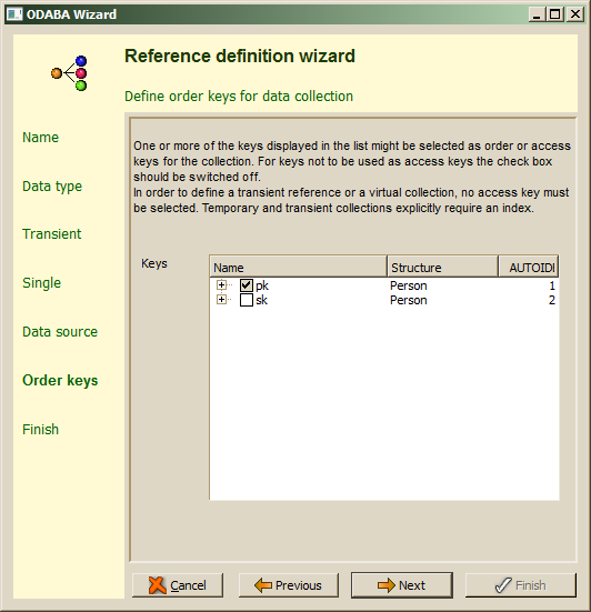 For temporary or transient collections, a data source might be defined for filling the collection. Temporary or transient collections with a data source definition are filled only, when being accessed. For reference collections, the collection will be reset, when the owning instance is unselected. The Next step allows selecting one or more access keys (order keys).
