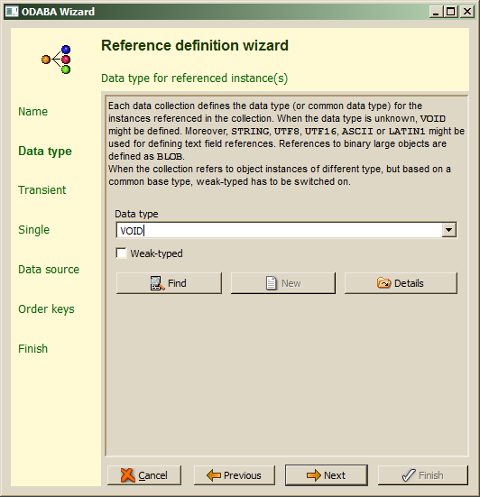 The Data type field should contain the type or a common base type of data instances referenced in the transient reference later on. For referring to any type of instance VOID has to be defined. Th data type will be checked when assigning a property handle to the transient reference. After assigning a property handle, property definition from the assigned property handle is used. Thus, one may set the transient option, but one need not.