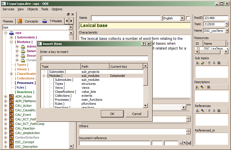 After selecting a terminology model, one may create sub models or modules before defining types or classifications. This can be done by clicking on the selection tree and selecting Insert (ctrl+I) from the context menu. Than an insert dialog pops up, where one may select the type and the tree level for the object to be created. After entering the name for the sub-model or module you should check, that the proper type is selected in the type tree in the insert dialog and press OK .