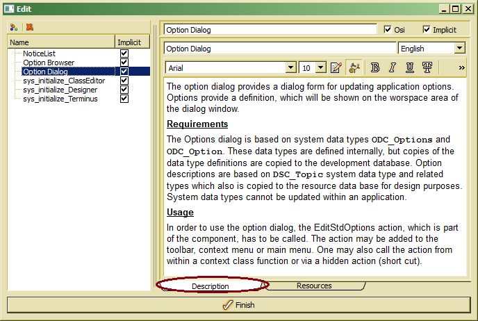 When context classes defined for component or related resources are implemented in C++ or C# and are also available as OSI classes, the OSI option should be switched on. This allows requesting the OSI implementation when installing the resource. For defining an OSI version for the component, OSI functions have to be provided in an active namespace OSI_IF using the same name as the original class name.
