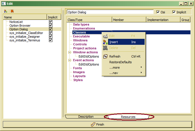 In order to add a resource to a component, select the resource type to be included and select Insert from the context menu. Depending on the component type a component specific insert dialog pops up: