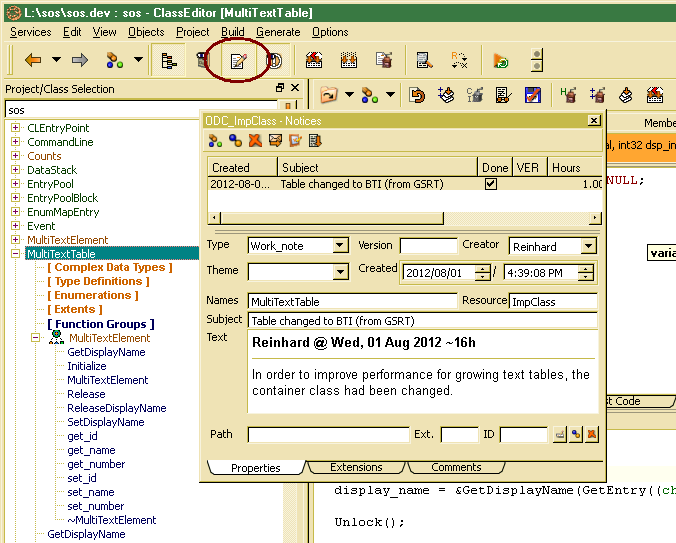 In order to document changes in development resources (data types, members, functions, parameters, forms, controls, documentation …), notices may be attached directly to the currently selected (active) development resources. The active resources is, typically, the last item selected in a list or the development resource that currently has got the focus.