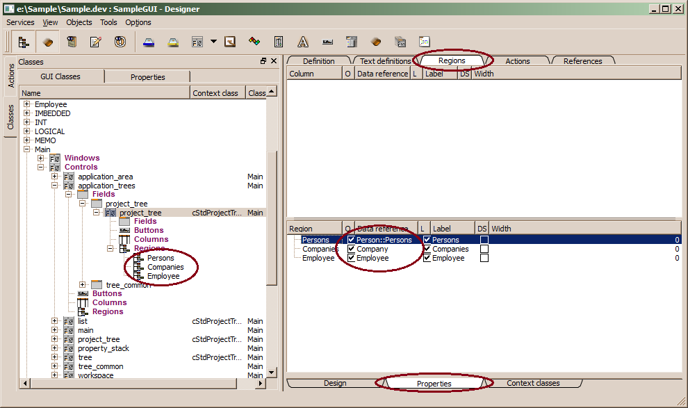 The next step, usually is to assign data sources to fields and regions in the control. In the example, the project tree should show two regions, for Person ::Persons and Company ::Companies . In order update region data sources, one may select the Main ::project_tree control and select Regions on the right side property window.