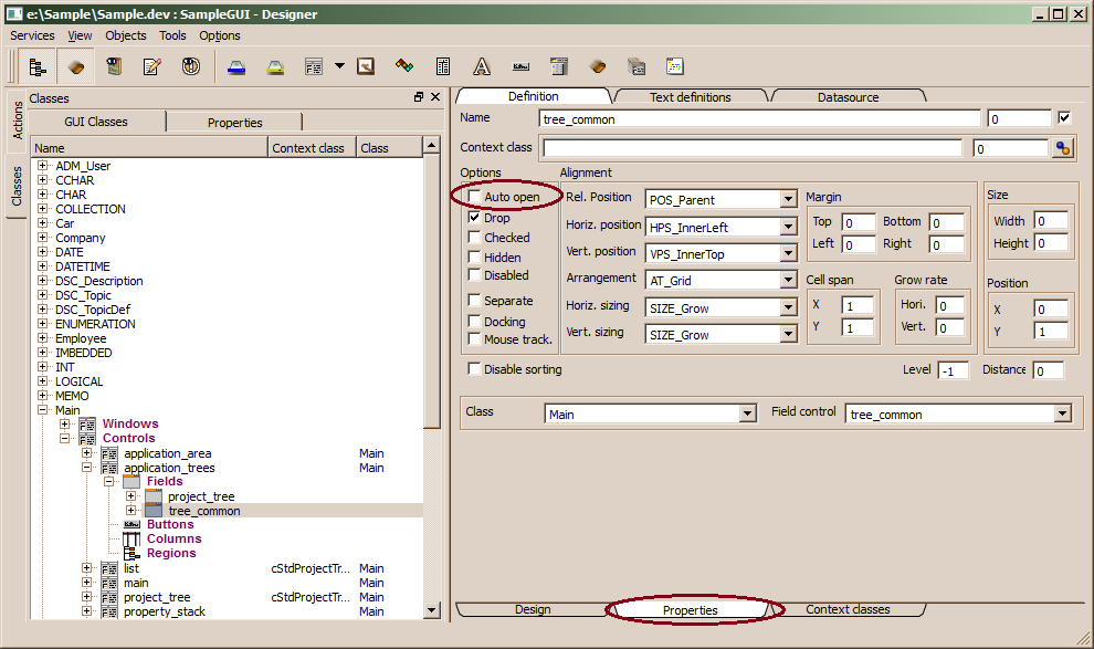 In order to deactivate, e.g. the second tab, you switch to the Properties view (down tab), select the field tree_common in control application trees and deactivate the Auto-open check box (right). When you test the application again ( Test window ), the tree area shows only one tabs.
