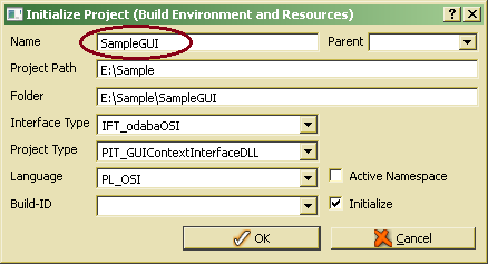 When the Designer starts up, it requires to initialize a project. The project name, e.g. Sample , is usually used for the resource project which is identical with the schema name when loading a database scheme from an ODL file. In order to initialize a GUI context interface project, one should define a name different from the resource project (e.g. SampleGUI ).