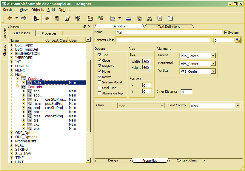 A window or dialog provides a (usually) movable frame for a control. While the control referenced in the window definition defines the dialog content, the dialog itself defines the the frame and its behavior. Window properties are accessible when selecting the window in the class list and choosing the property view ( Property tab bottom of the workspace).