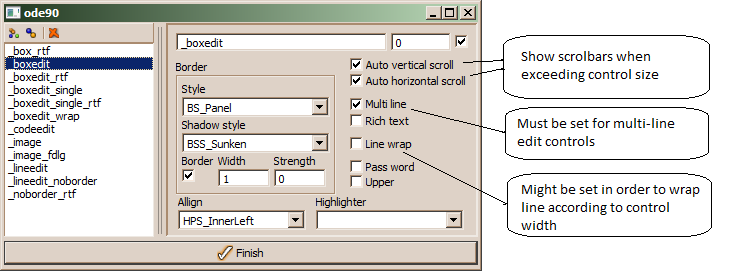 In order to define a multi-line edit control, the control should be associated with an edit style. As default style for multi-line edits, _boxedit is provided in the resource database after initializing GUI resources. In order to create, update or browse edit styles, one may select Objects/Styles/Edit .