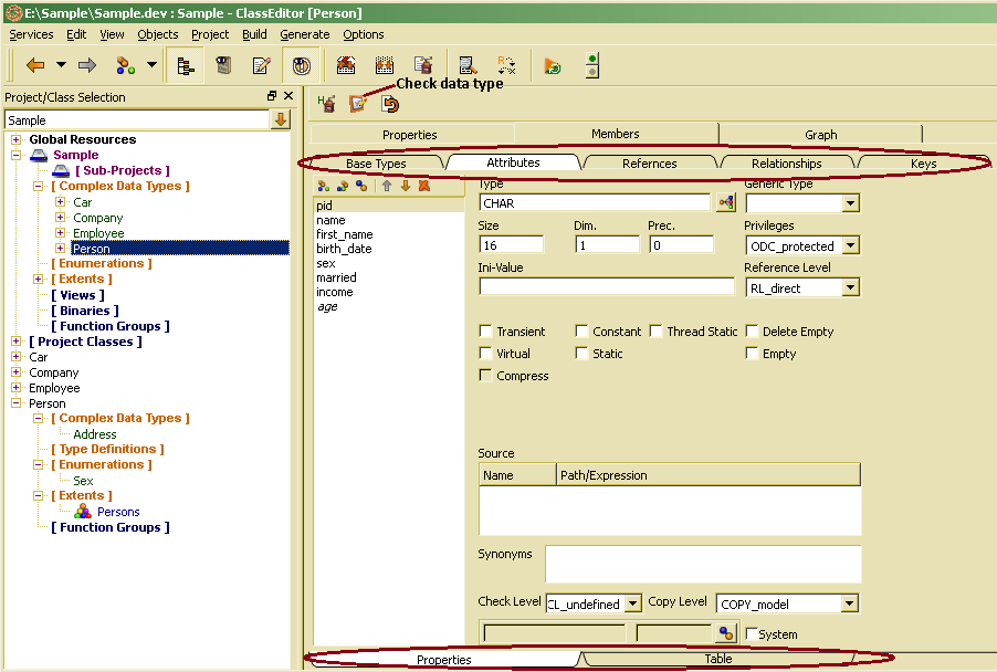 For first test it is suggested to use OSI interface (IFT_odabaOSI), which is the default setting, when the project has been initialized as OSI project before. We suggest using OSI interface in order to build fast prototypes. Since OSI provides a script interface, compiling and linking is not necessary. After clicking OK, ClassEditor resources will be initialized which may take up to 1 minute. After a while, the ClassEditor opens and displays project classes. The default view shows the class view, i.e. the three persistent sample classes. In order to view structure (complex data type) properties, Sample/Structures has to be expanded in the tree.