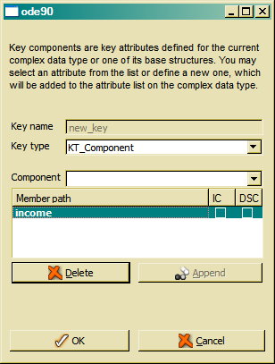 Clicking the Append button will add the attribute to the key component list. When defining a key component that does not yet exist as attribute, an attribute with the key component name will be created for the selected data type. By default, the data type for the new attribute is CHAR, which might be changed later editing the attribute in the attribute list.