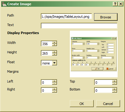 The action allows inserting an image into the text. The image has to be stored as file in an external folder. In order to change image layout options, one may be call the action (pressing the action button) after selecting the image in the text box. After clicking the action button The image dialog pops up: