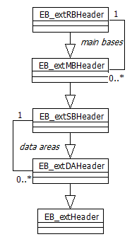 Base header properties are defined in corresponding database headers inheriting from each other. Thus, an EB_extRBHeader (rootbase header) is a main base header (EB_extMBHeader) which defines main base 0, but may also refer to a number of additional main bases.A main base header is a sub base header (EB_extSBHeader), which defines the only one sub base for a main base. A sub base header, again, is a data area header ()EB_extDAHeader), defining the data area 0.