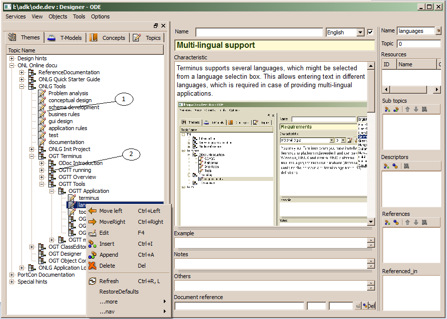 The topic hierarchy supports topic definitions in a hierarchical order, but also subtopics within a topic. One may also turn topics into subtopics and reverse. Drag and drop allow moving or copying topics within the hierarchy.